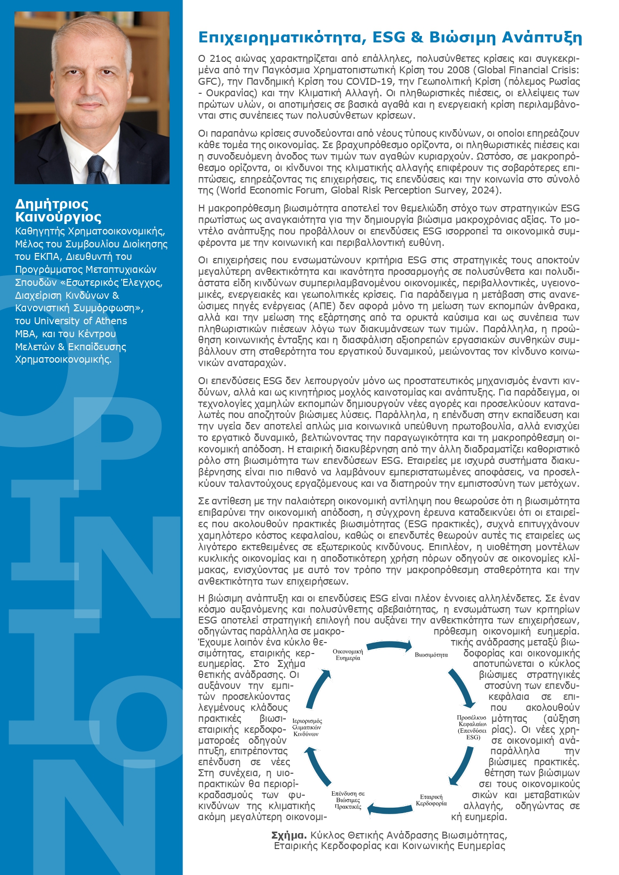 «Επιχειρηματικότητα, ESG & Βιώσιμη Ανάπτυξη», ο κ. Καινούργιος αναλύει τη στρατηγική σημασία της ενσωμάτωσης των κριτηρίων ESG στην επιχειρηματική πρακτική, ως μοχλό ανθεκτικότητας και μακροπρόθεσμης βιώσιμης ανάπτυξης.